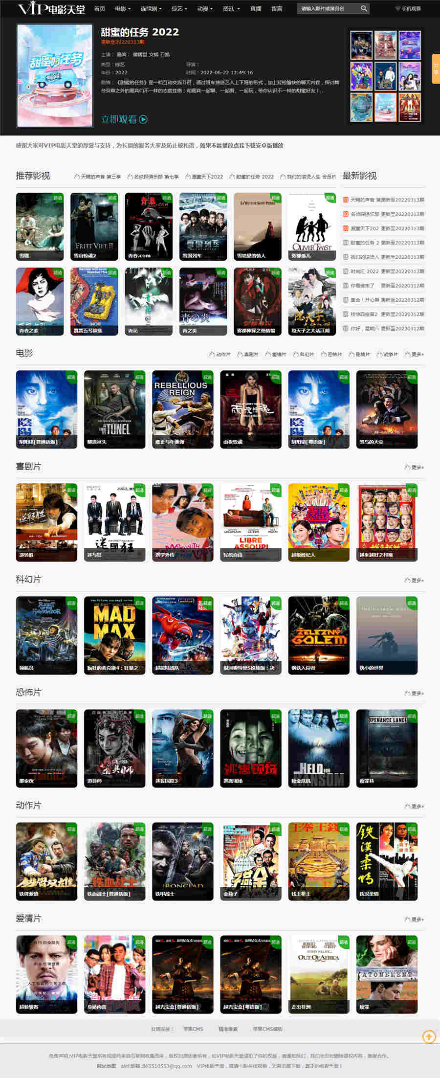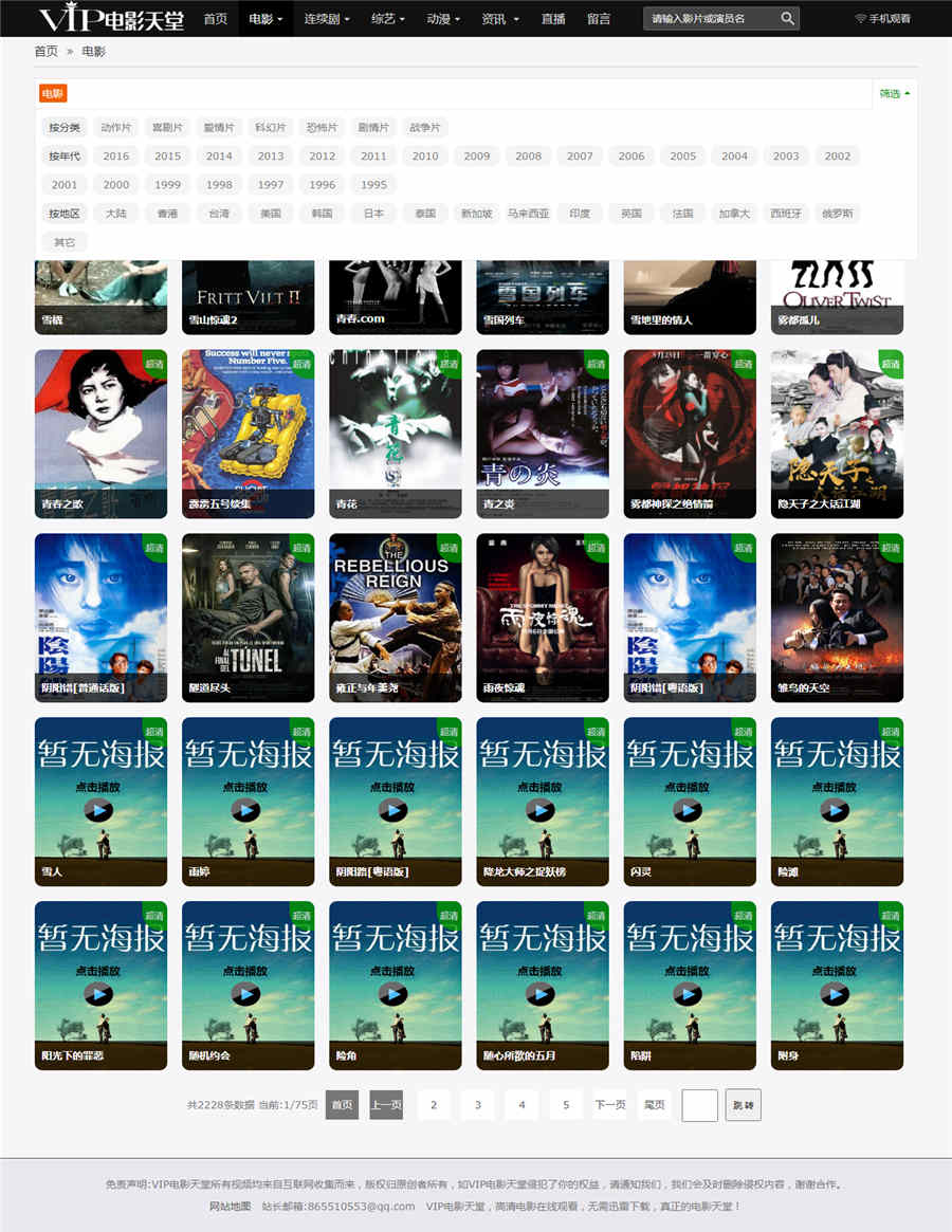 | 模板介绍: 仿VIP电影天堂影视网站模板,苹果CMSV8版本,自适应手机端,黑色风格。已测试完美无错,删除了部分失效代码。 包含影视模块和新闻模块,影视模块测试没有问题,新闻模块没找到测试资源,没测试,目测也应该不会有问题。 包含畅言的评论代码,不需要的可以删除,具体大家看演示截图就行。 模板截图 |