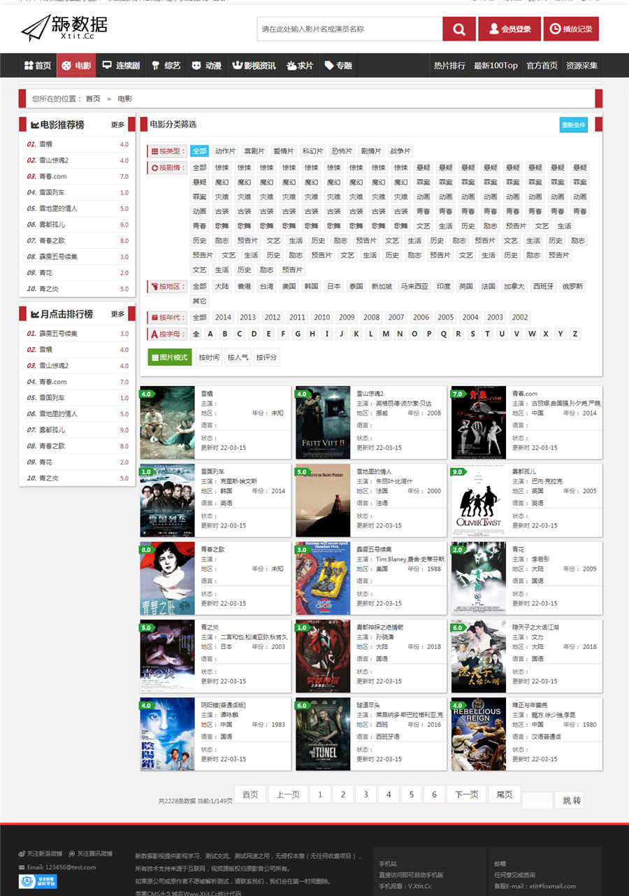 电脑端不自适应,风格简单。包含影视、新闻、会员、搜索、排行榜等等模块,属于全能型模板。